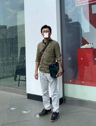 普段の服装:出かける時は、黒か白系のパンツ、無地のTシャツ、シャツ、黒か茶系のシューズが多いです。